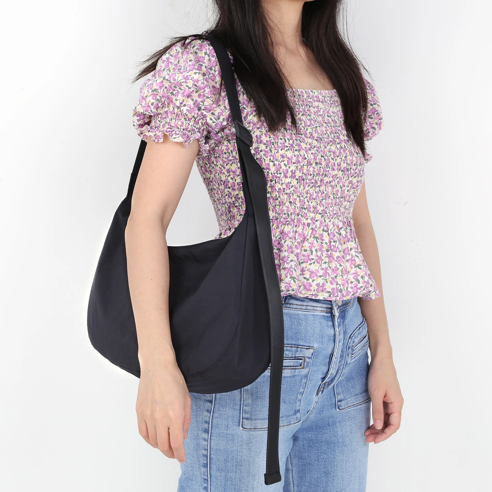 2. Versatile and Functional: Enjoy the versatility and functionality of this nylon shoulder bag. Its unique new moon shape not only adds a trendy touch but also provides a spacious interior to accommodate all your necessities. Designed with your convenience in mind, this bag can be worn diagonally across your shoulder or body, allowing you to go about your day hands-free.